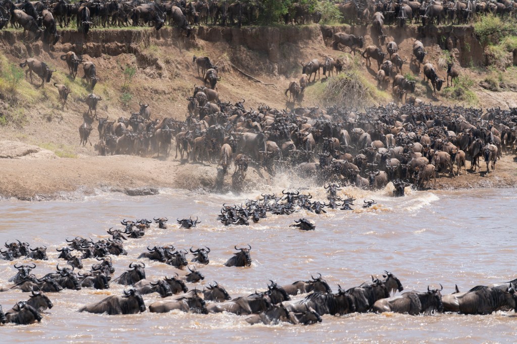 尼罗Mara河是在这大迁徙过程中马群会经历的一大生死考验。受伤的,以及体弱多病的角马很可能会在渡河时溺水或者被河水冲走;运气不好的角马也随时可能会在渡河过程中成为其他动物的美食。所以大迁徙的马群又称:大草原上的送餐大队(误) - 观看马群渡河需要运气,耐心,和漫长的等待。而且等待期间观光车不能靠的太近否则会吓到马群让它们不敢渡河。