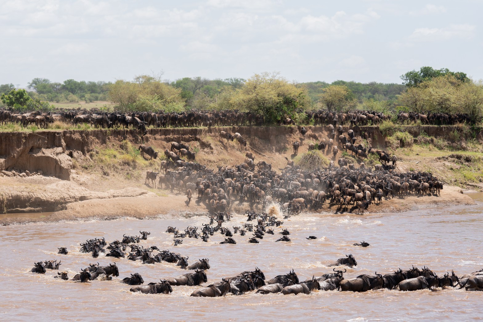 渡河的主角,角马,对水汽的嗅觉十分灵敏。当某个方向发生过降雨之后,雨水在阳光下蒸发,就会吸引角马群向这个方向迁徙。(所以大迁徙并不是稳定有序的画圈,而是马群被降雨牵着鼻子跑的过程)当降水集中在河的另一边,角马就会纷纷被水汽吸引到河边。当河岸上角马的数量越积越多,“堆积”的马群就会对河边的领队造成压力,最终迫使领头的角马纵身下水渡河。当然在这个等待的过程中,领队的角马也会非常谨慎的观察环境,选择渡口。水流,河岸的陡峭程度,渡口附近是否有危险比如鳄鱼等等,都会被仔细检查(所以等候的观光车都不能靠的太近)。一旦领队觉得有危险,就会带队走向下一个渡口(以及对岸成群结队等候的观光车)。